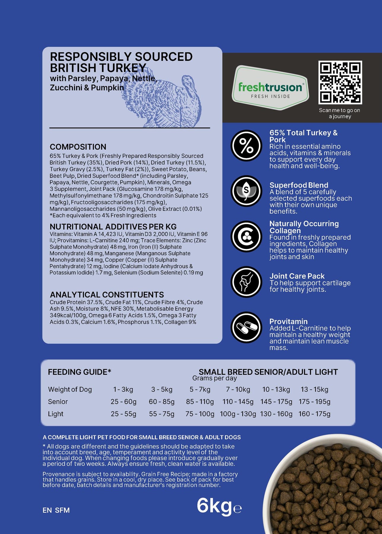 Responsibly sourced British Turkey, Pork, Sweet Potato & Potato for steady energy, Salmon Oil for omega-3s, plus Parsley, Papaya, Nettle, Zucchini & Pumpkin; balanced with vitamins and chelated minerals for complete light nutrition.