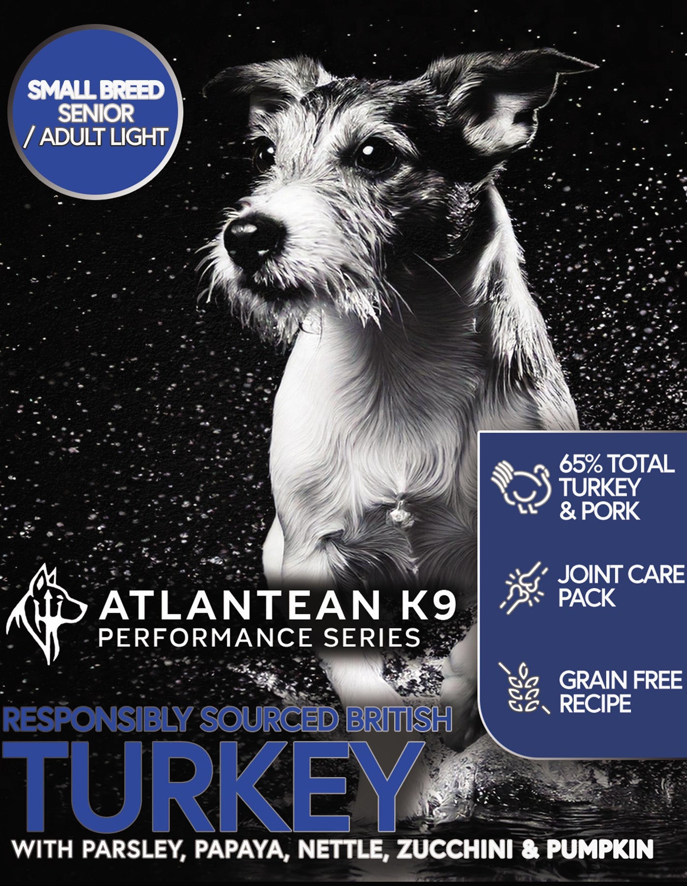 On ops we learned to keep dogs lean, strong and moving well—by fuelling smart. Our British Turkey Small Breed Senior / Adult Light recipe does the same: high-quality protein with lighter calories, grain-free comfort and daily joint care—shaped for small mouths.