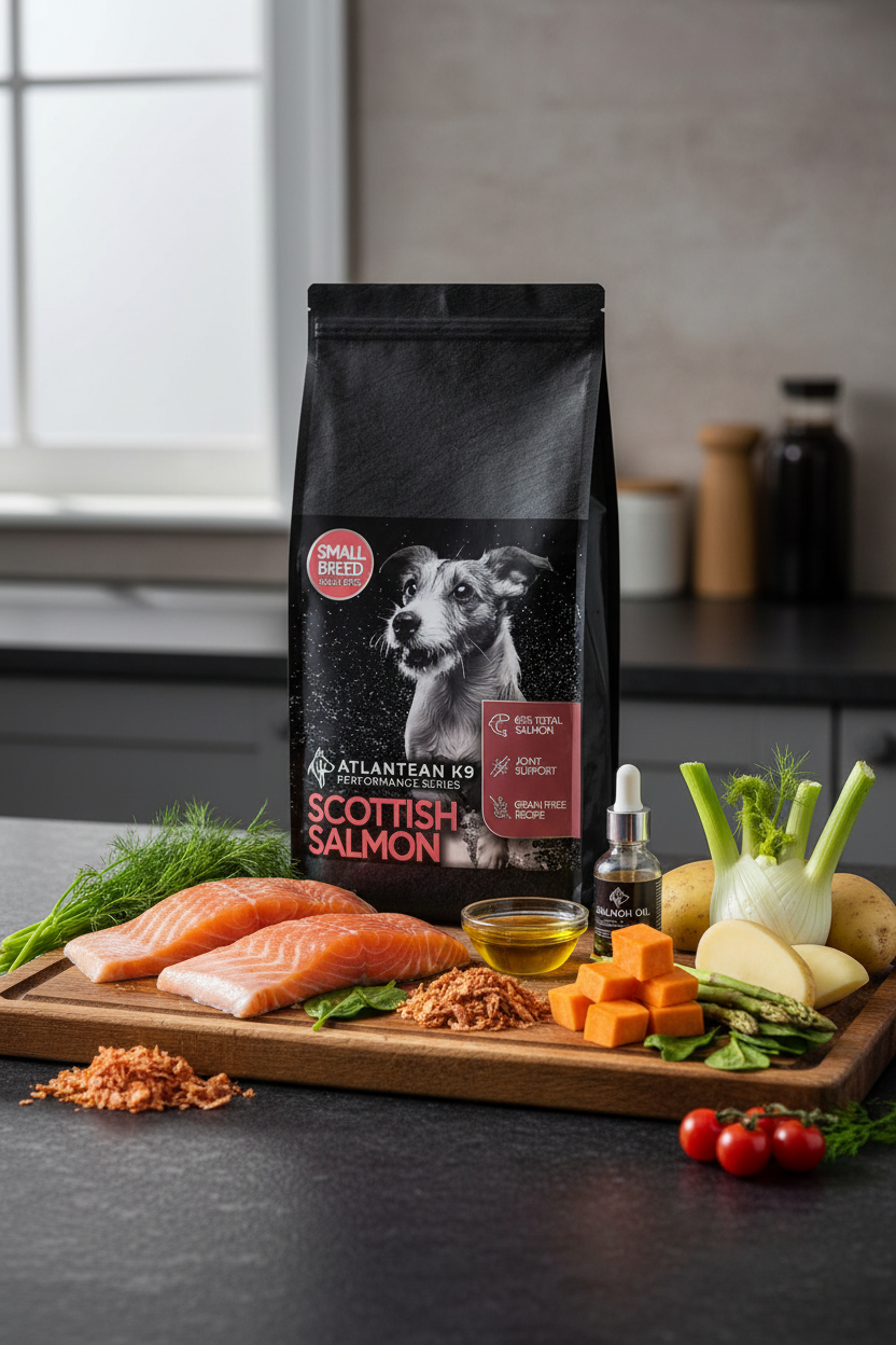 Working with a military working dog taught me that precision matters—fuel, routine, recovery. Our Scottish Salmon (Small Breed) recipe brings that same standard to little dogs: high salmon content for lean condition, grain-free comfort, and daily joint support in a kibble sized for small mouths.