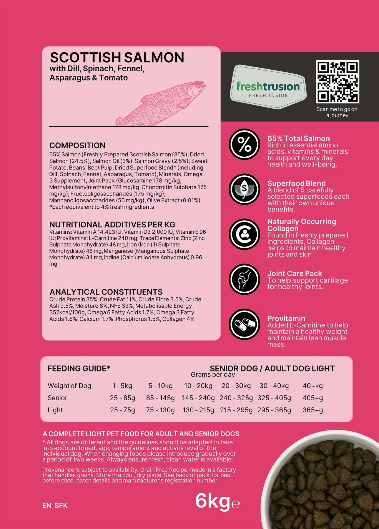 Scottish Salmon, Sweet Potato & Potato for steady energy, Salmon Oil, Dill, Spinach, Fennel, Asparagus and Tomato for natural phytonutrients; vitamins and chelated minerals to round out complete adult nutrition.